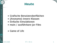 Heute • • • • Grafische Benutzeroberflächen (Anonyme) innere Klassen Einfache Simulationen main / ausführbare jar-Files • Game of Life 16.01.2020 IT I - VO 11 1 Organisatorisches • Heute…